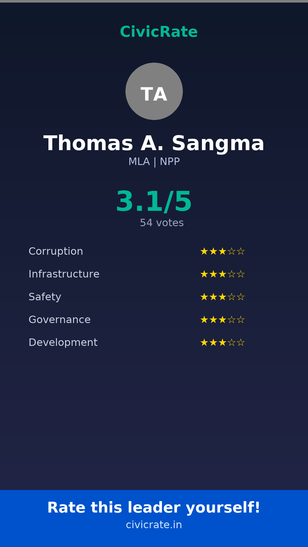 Thomas A. Sangma (MLA, NPP) has an overall citizen rating (CR Score) of 3.1/5 based on 54 anonymous votes on CivicRate. The score covers 5 parameters: Corruption Perception, Infrastructure, Safety, Governance, and Development.