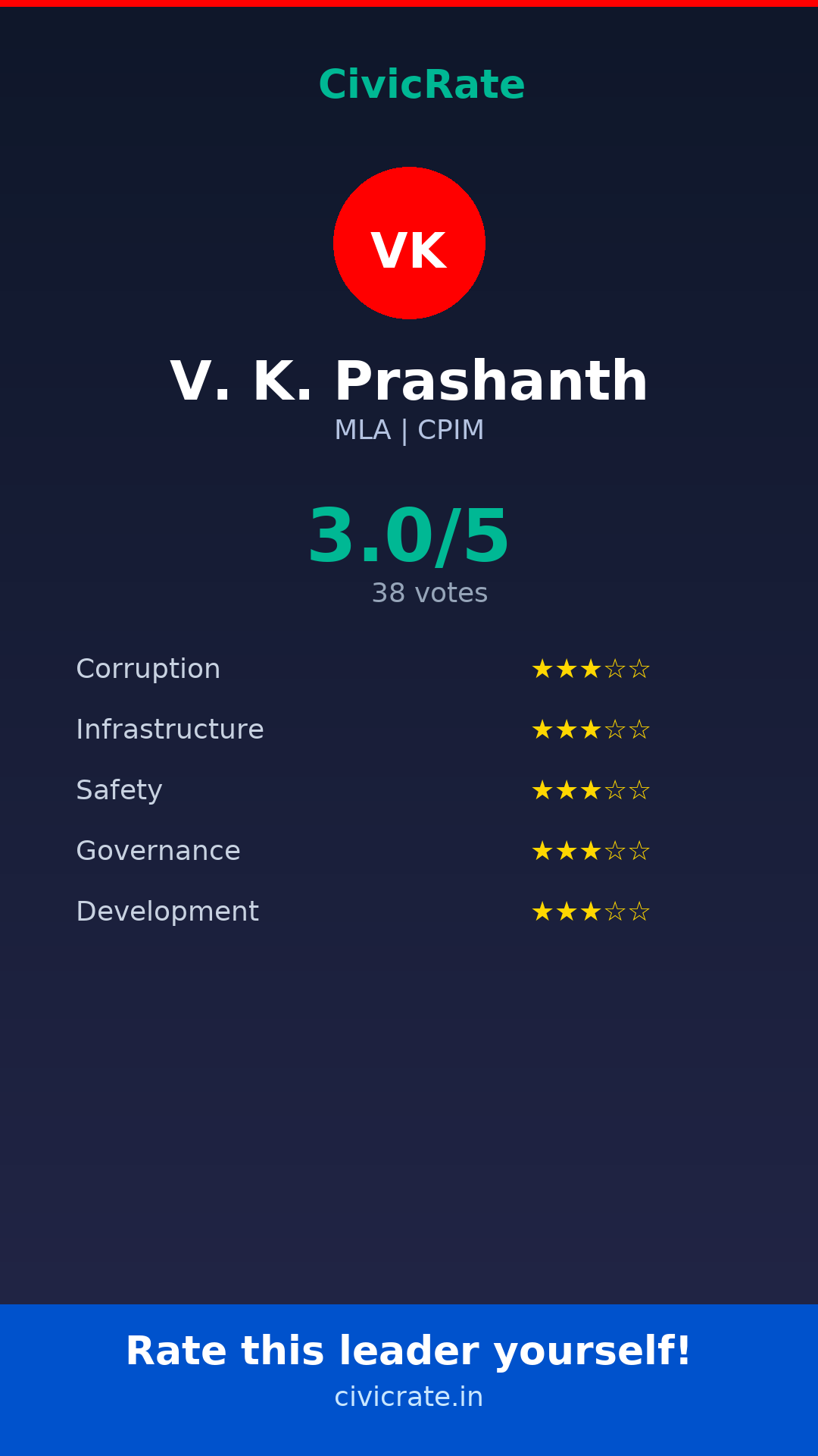 V. K. Prashanth (MLA, CPIM) has an overall citizen rating (CR Score) of 3.0/5 based on 38 anonymous votes on CivicRate. The score covers 5 parameters: Corruption Perception, Infrastructure, Safety, Governance, and Development.