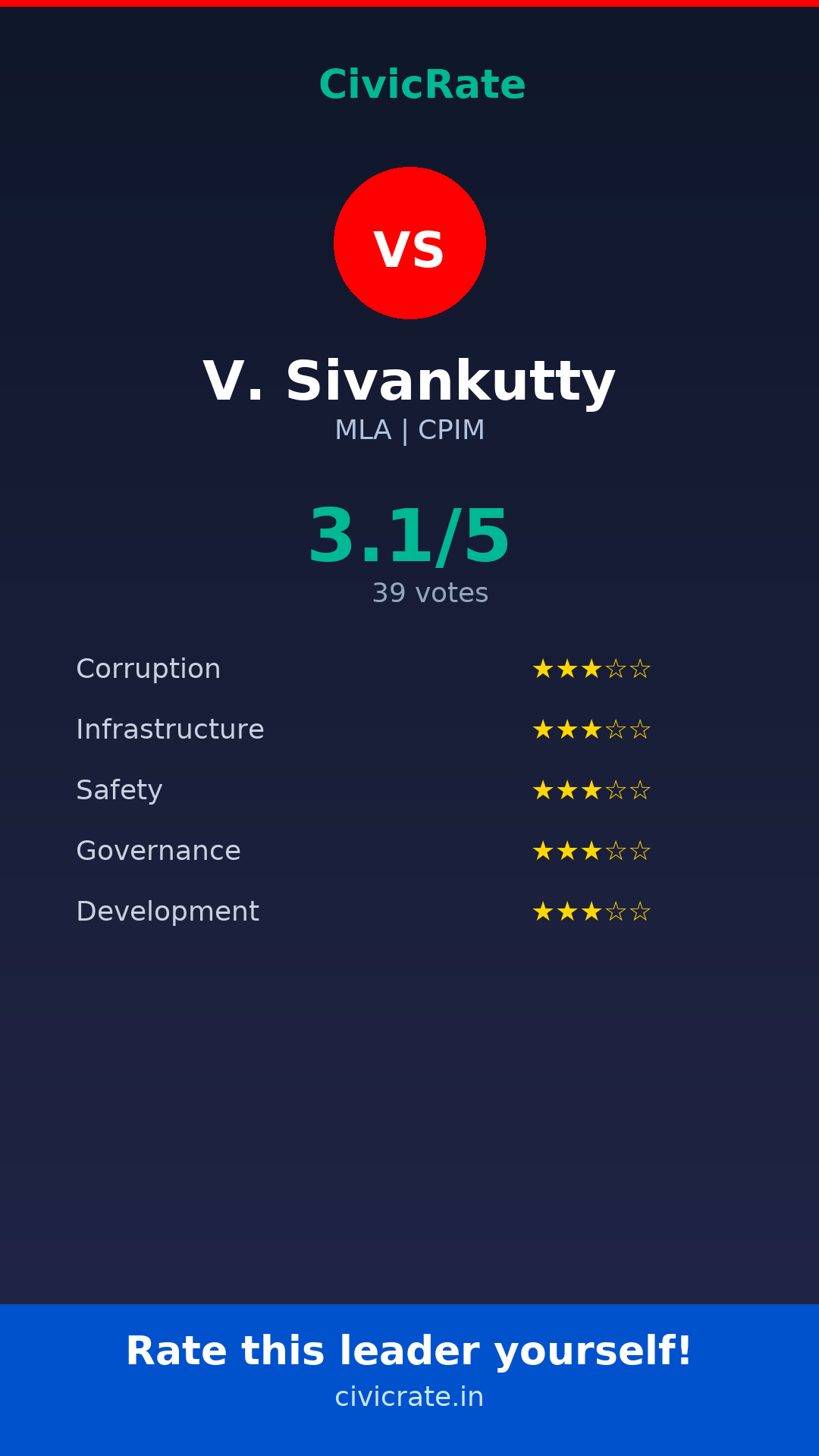 V. Sivankutty (MLA, CPIM) has an overall citizen rating (CR Score) of 3.1/5 based on 39 anonymous votes on CivicRate. The score covers 5 parameters: Corruption Perception, Infrastructure, Safety, Governance, and Development.