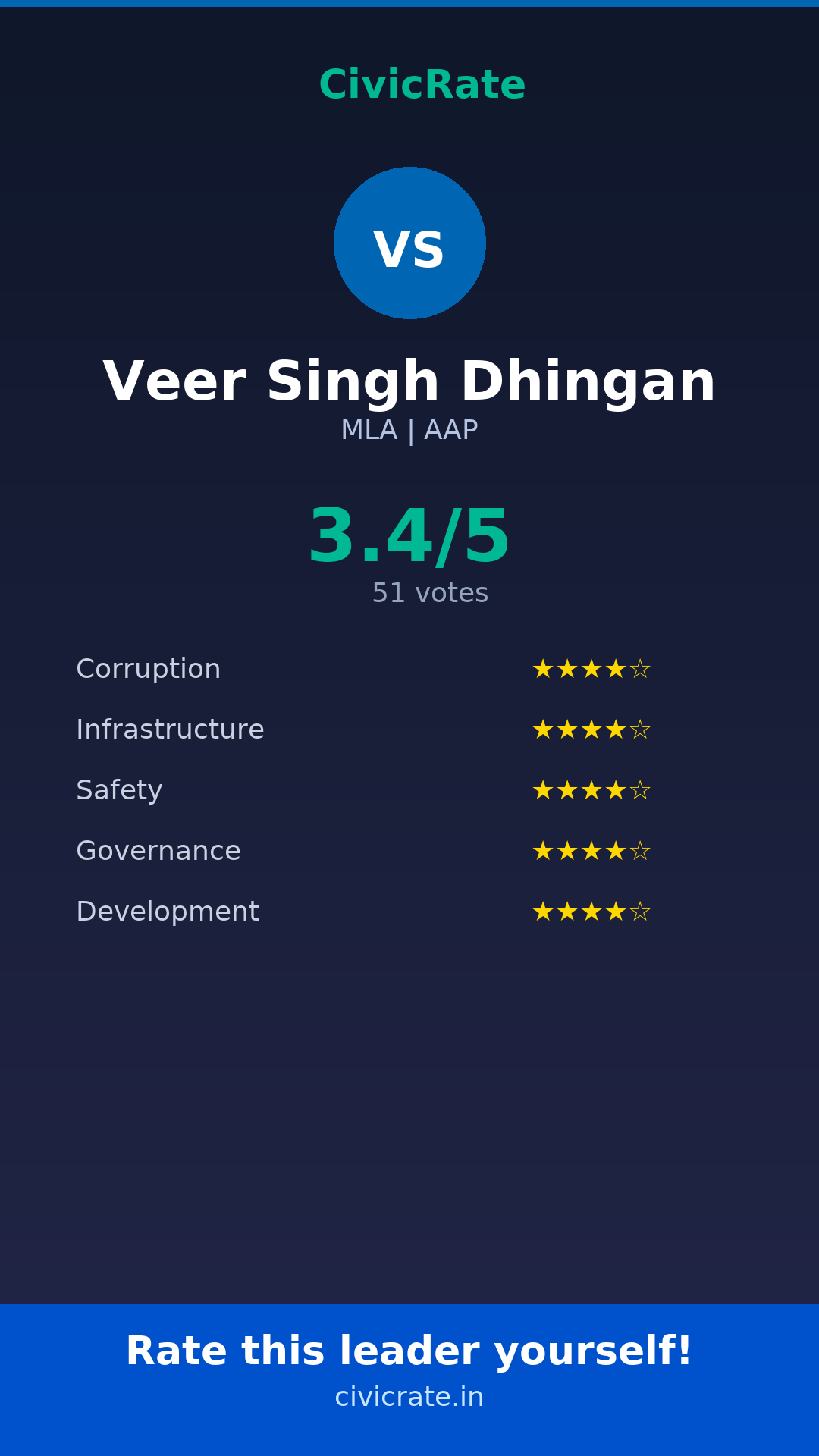 Veer Singh Dhingan (MLA, AAP) has an overall citizen rating (CR Score) of 3.4/5 based on 51 anonymous votes on CivicRate. The score covers 5 parameters: Corruption Perception, Infrastructure, Safety, Governance, and Development.