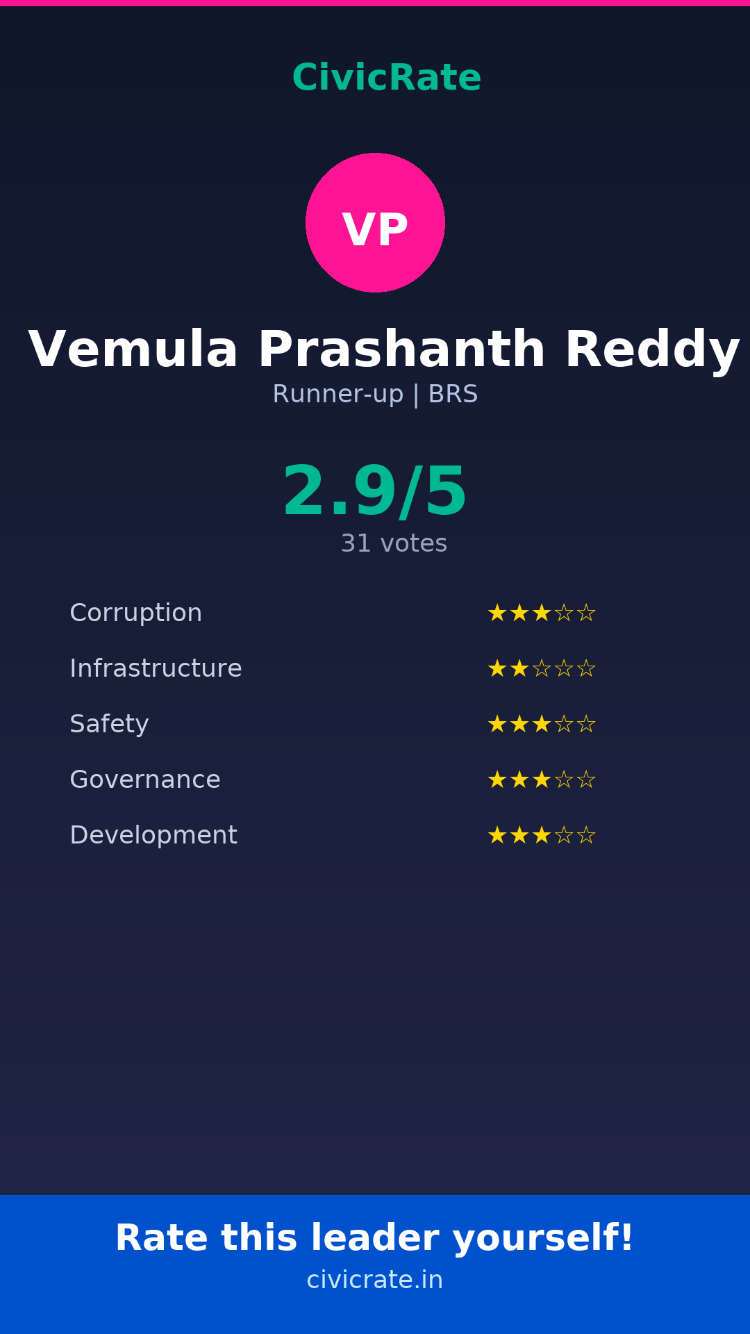 According to 31 citizen ratings on CivicRate, Vemula Prashanth Reddy has a moderate corruption perception score of 2.8/5 (where 1 = cleanest, 5 = most corrupt). This reflects public perception, not legal findings.