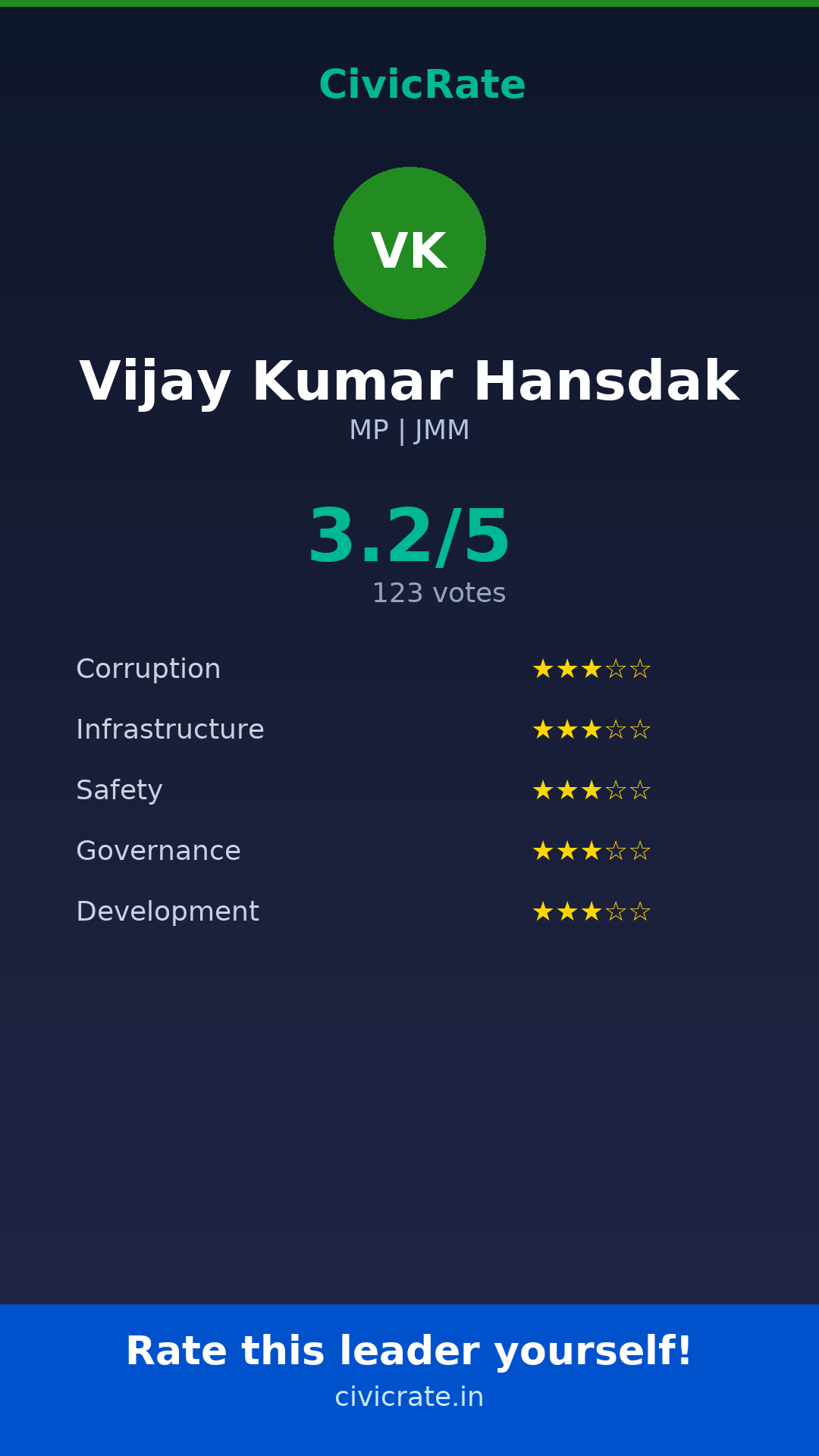 Vijay Kumar Hansdak (MP, JMM) has an overall citizen rating (CR Score) of 3.2/5 based on 123 anonymous votes on CivicRate. The score covers 5 parameters: Corruption Perception, Infrastructure, Safety, Governance, and Development.