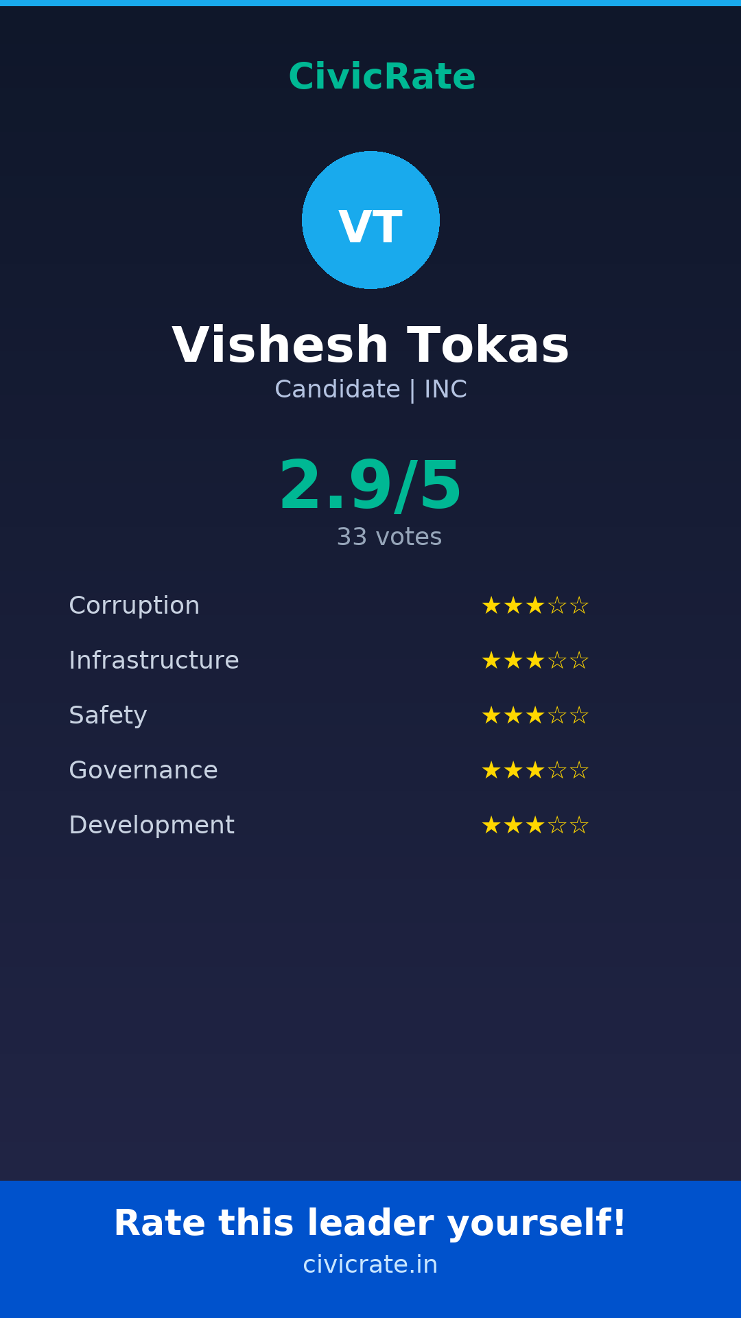 Vishesh Tokas (Candidate, INC) has an overall citizen rating (CR Score) of 2.9/5 based on 33 anonymous votes on CivicRate. The score covers 5 parameters: Corruption Perception, Infrastructure, Safety, Governance, and Development.