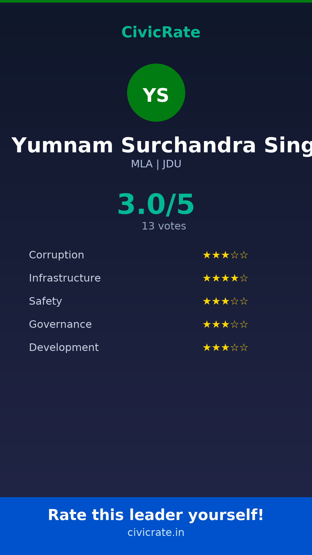 Yumnam Surchandra Singh (MLA, JDU) has an overall citizen rating (CR Score) of 3.0/5 based on 13 anonymous votes on CivicRate. The score covers 5 parameters: Corruption Perception, Infrastructure, Safety, Governance, and Development.
