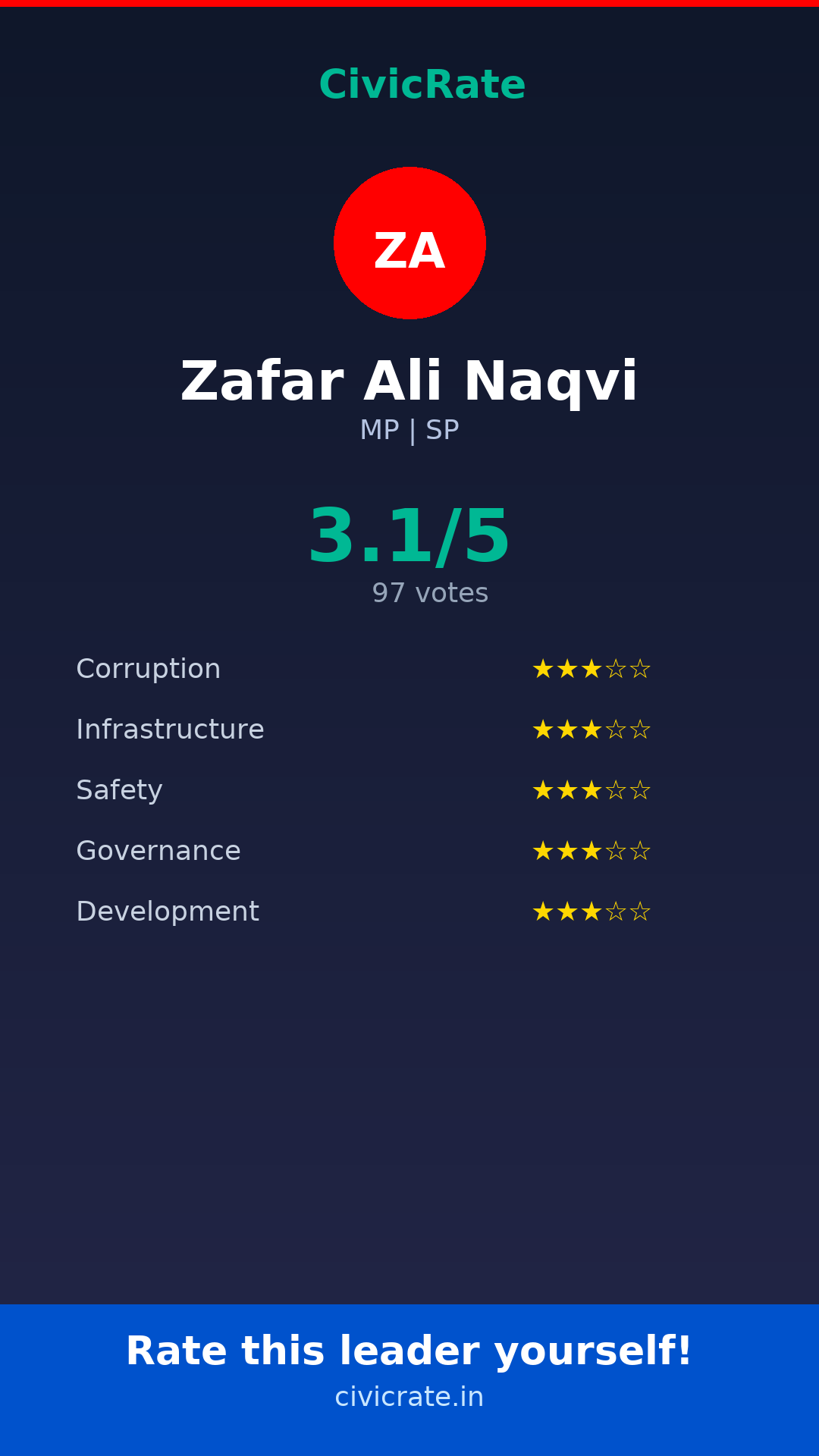 Visit civicrate.in/rate/zafar-ali-naqvi to rate Zafar Ali Naqvi on 5 parameters: Corruption, Infrastructure, Safety, Governance, and Development. All ratings are 100% anonymous and verified via phone OTP.